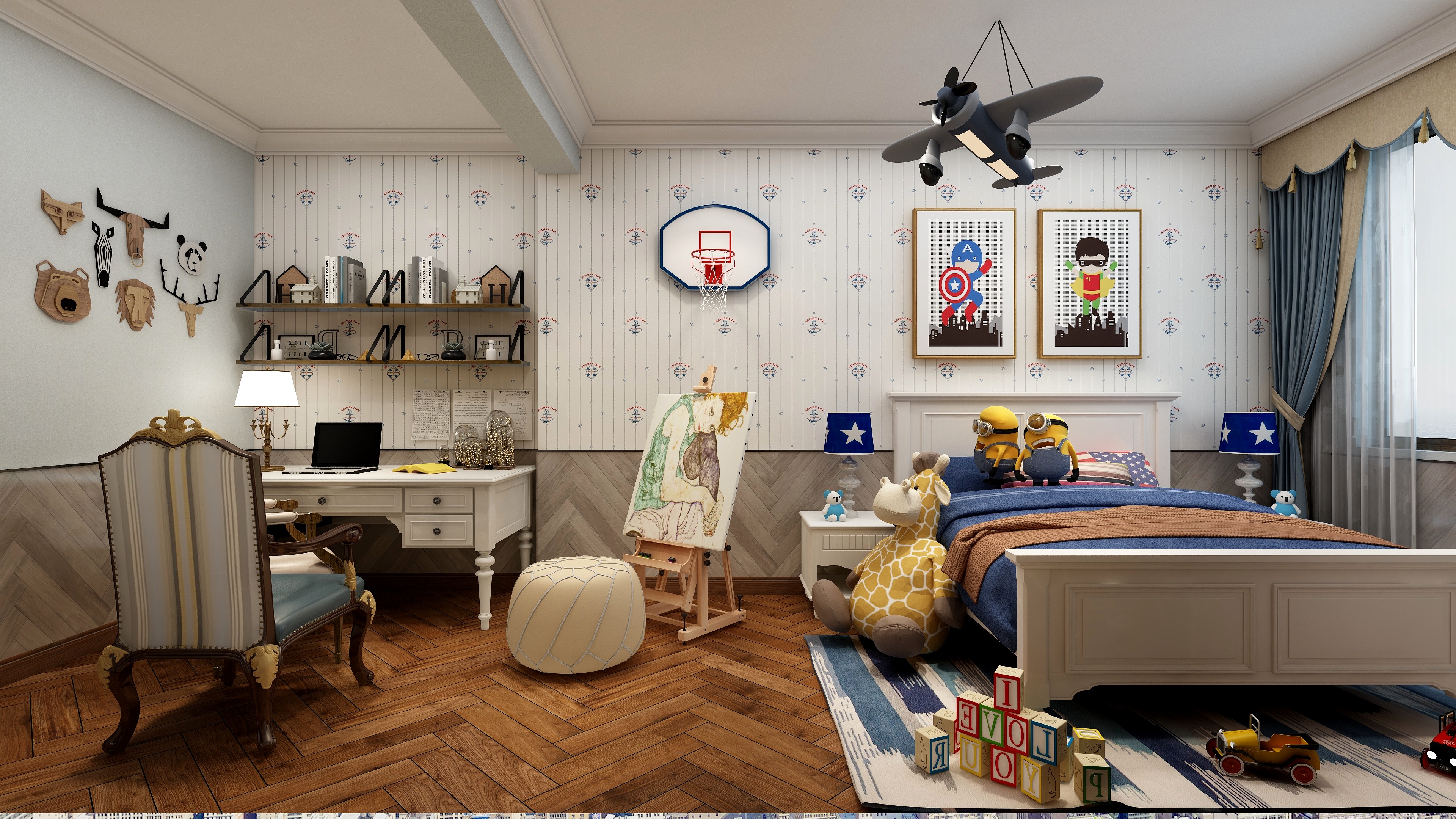 兒童房顏色是因人而異的,不同的色彩營造的氣氛是不一樣的,對于兒童的影響是自然是不同的。如果你家是一個男孩子,盡量把墻面打造成藍(lán)天白云,綠草茵茵的的那種境界。墻是選擇藍(lán)顏色,頂面可做白色,感覺是藍(lán)天下踢足球,是望的號召。如果你希望孩子健康快樂成長,采用綠色也是很不錯的選擇。